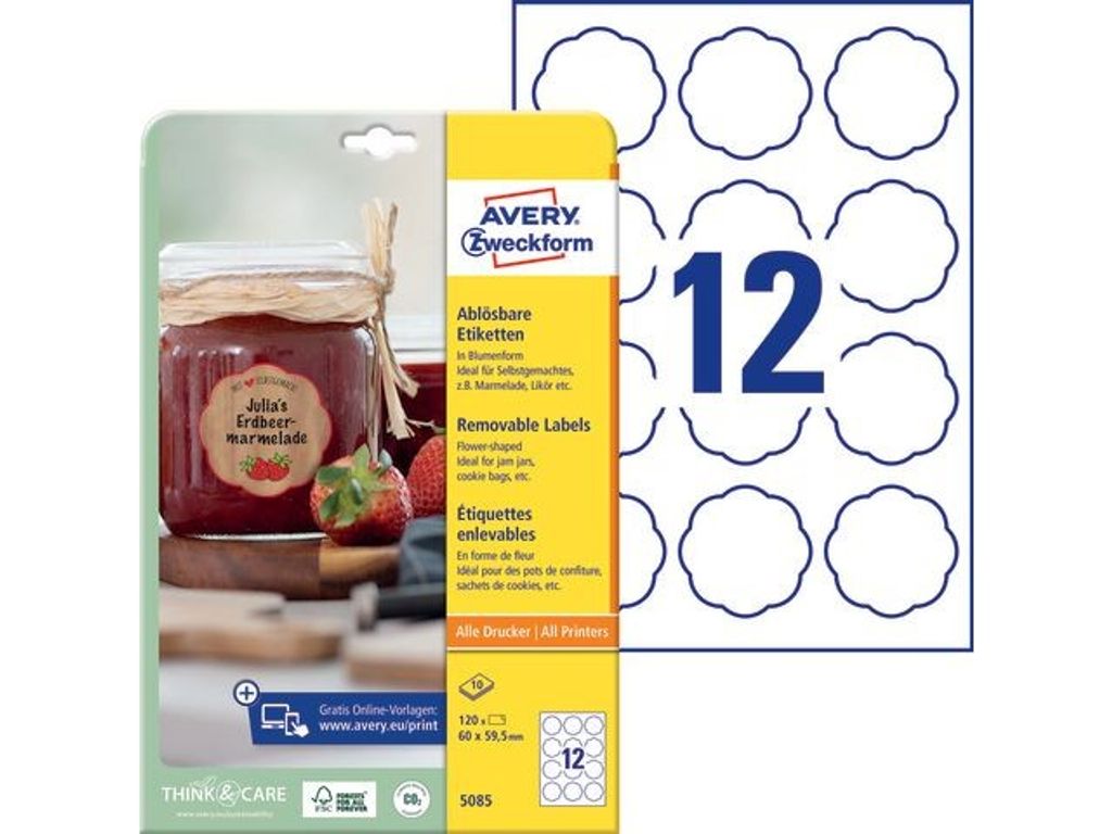 Blomformade etiketter som är perfekt för märkning av exempelvis syltburkar, kakpåsar osv. Dessa etiketter fäster effektivt på glas, folie och papper – och är lätta att ta av igen. Etiketter som imponerar med ett skarpt och hållbart tryck som ser professionellt ut. Etiketterna kan användas för en mängd olika ändamål. God vidhäftningsförmåga på både glas, folie och papper, och samtidigt enkla att ta av igen. Oavsett vilken typ av produkt du gör, kan du med Averys avtagbara blomformade produktetiketter göra etiketter i egen design eller med ditt eget budskap. I några få enkla steg designar du och skriver ut din personliga etikett på din egen skrivare: För alla etiketter i Averys sortiment kan du använda deras gratis programvara Avery Design & Print. Du får ett exklusivt urval av vackra och moderna designmallar att välja mellan. Skapa en fördesignad mall med din egen information, eller skapa din egen design på en tom mall. Skriv sedan ut på de förstansade etiketterna och fäst dem på dina produkter! Läs mer om mjukvaran här: www.avery.se/programvara - PVC-fri - Klorfri - Mått (b x h): 60 x 59,5 mm - Skrivare: Alla typer av skrivare - Limtyp: Avtagbara - Färg: Vit - Material: Papper - Produktegenskaper: För glas och flaskor - Form: Blommaformad - Format: A4
