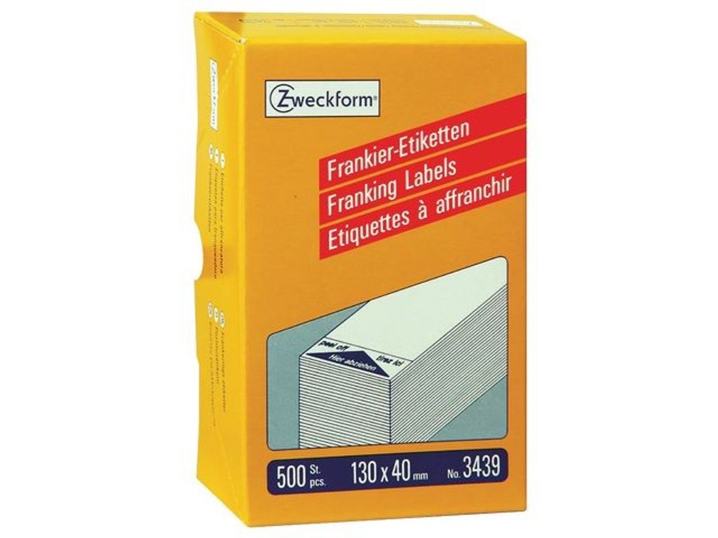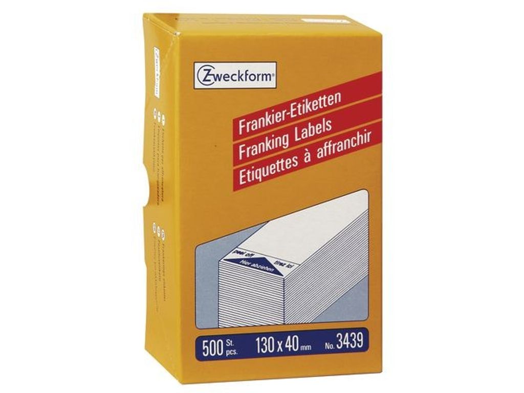 För alla frankeringsmaskiner 164 x 41 mm De flesta kontor har en frankeringsmaskin för sin post. Averys frankeringsetiketter 3438, 130 x 40 mm, med en etikett/ark och 500 etiketter/förpackning är professionella frankeringsetiketter på ark för alla vanliga frankeringsmaskiner med vanliga färgrullar och är lämpliga för frankering av kuvert, poströr, paket och andra försändelser. Etiketterna är långa och har plats för t.ex. avsändaradress och logotyp. De är snabbtorkande etiketter som garanterar att frankeringen är klar och tydlig från avsändning till ankomst. De har utmärkt vidhäftningsförmåga på kuvert, poströr, paket och andra försändelser samt levereras i en praktisk ask. Särskilt lämpliga för: Särskilt lämpliga för: Pitney Bowes (PB 6211, E201, E211, E501, E566, E511, E531, E581, E586, DM200, DM300, DM300C, DM400C, DM450C+) och Neopost (Ascom Hasler) - Mått: 130x40mm - Snabbtorkande etiketter - Långa etiketter med plats för avsändaradress och logotyp - Kan användas i alla vanliga frankeringsmaskiner - Levereras i praktisk ask