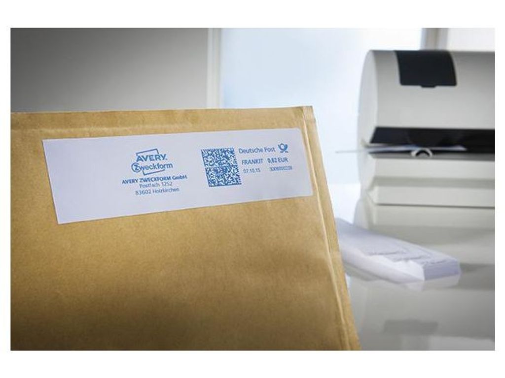 De flesta kontor har en frankeringsmaskin för sin post. Averys frankeringsetiketter 3435, 135 x 38 mm, med två etiketter/ark och 1 000 etiketter/förpackning är professionella frankeringsetiketter på ark för alla vanliga frankeringsmaskiner med vanliga färgrullar och är lämpliga för frankering av kuvert, poströr, paket och andra försändelser. Etiketterna är långa och har plats för t.ex. avsändaradress och logotyp. De är snabbtorkande etiketter som garanterar att frankeringen är klar och tydlig från avsändning till ankomst. De har utmärkt vidhäftningsförmåga på kuvert, poströr, paket och andra försändelser samt levereras i en praktisk ask. - Mått: 135 x 38 mm - Antal: 1000 st per förpackning