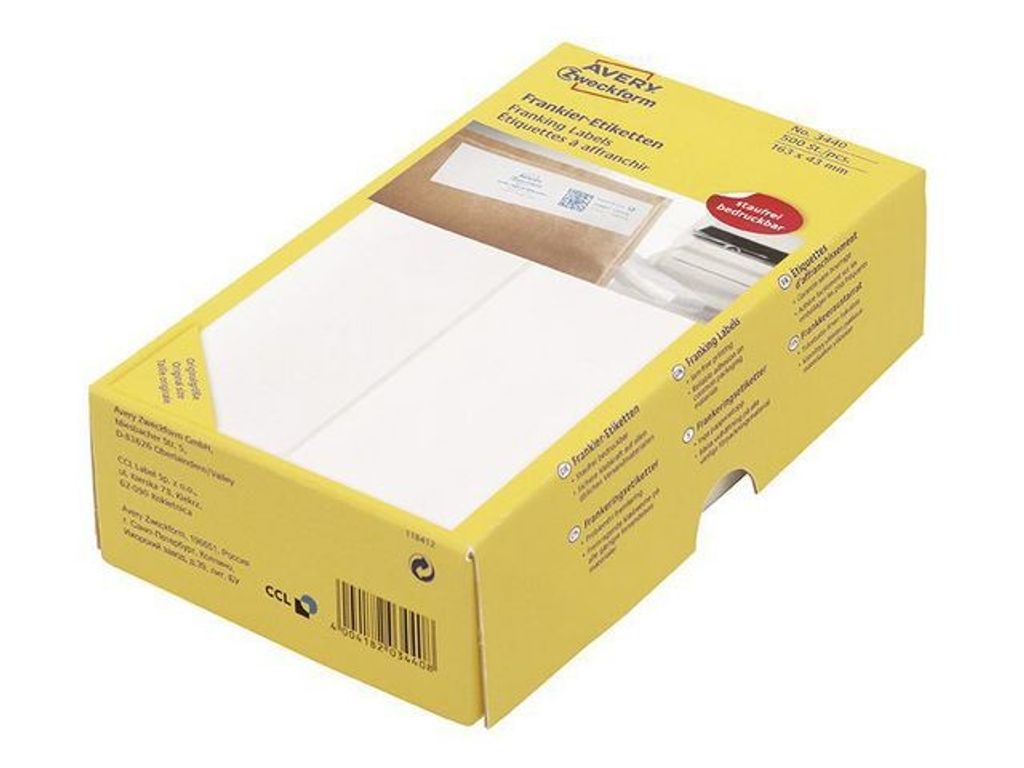 De flesta kontor har en frankeringsmaskin för sin post. Averys frankeringsetiketter 3440, 136 x 43 mm, med två etiketter/ark och 500 etiketter/förpackning är professionella frankeringsetiketter på ark för alla vanliga frankeringsmaskiner med vanliga färgrullar och är lämpliga för frankering av kuvert, poströr, paket och andra försändelser. Etiketterna är långa och har plats för t.ex. avsändaradress och logotyp. De är snabbtorkande etiketter som garanterar att frankeringen är klar och tydlig från avsändning till ankomst. De har utmärkt vidhäftningsförmåga på kuvert, poströr, paket och andra försändelser samt levereras i en praktisk ask. Särskilt lämpliga för: Francotyp Postalia (Optimail, Optimail 30, T1000, EFS, jetmail, ultimail, PostBase, mymail, PostBase Mini), Pitney Bowes (5610, 5630E, 6100, 6300, U561, 6200, E500-serien, DM100, DM50, PersonalPost), Neopost (IJ-10, IJ-25, IS-330, IS-350), Stielow (Portostar 2205, 5505, 7000, 7150, 7156, 5400, 5460) och Frama (EcoMail, OfficeMail, Sensonic2000) - Mått: 163x43mm
