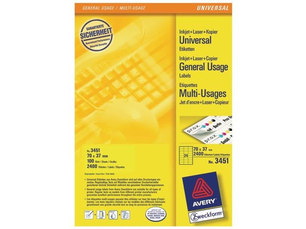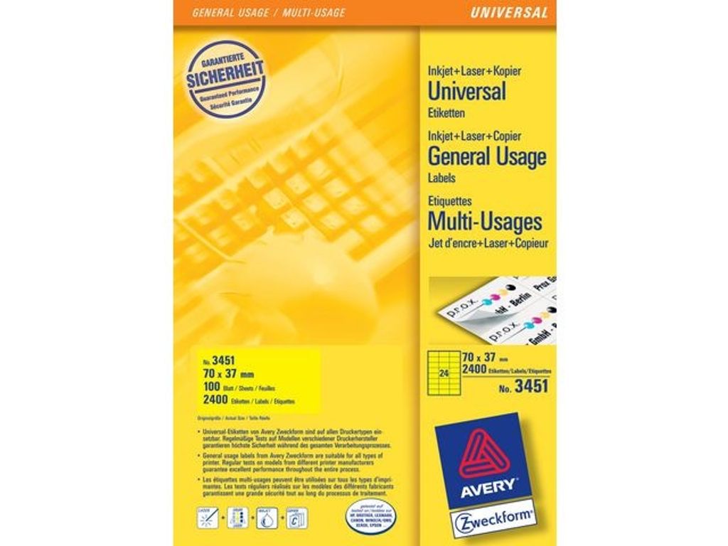 Permanenthäftande färgade etiketter Färgade etiketter får mer uppmärksamhet. Alla företag uppskattar ordning. Ett sätt att skapa ordning är att sortera dina dokument efter färg, t.ex. med Avery 3451 permanenthäftande etiketter med 24 etiketter/ark och 2400 etiketter/förpackning: blåa för dina kunders dokument, gula för dina leverantörer, röda för interna dokument osv. Detta innebär att varje medarbetare enkelt och snabbt får överblick över hur saker och ting är organiserade. Du kan också använda etiketterna som säljfrämjande etiketter, för märkning av produkter, emballage och broschyrer eller för att framhäva ny eller särskild information. Kan skrivas ut på alla skrivare, och Averys JamFREE™-garanti säkerställer dessutom att du inte behöver bekymra dig för om etiketterna fastnar i skrivaren och orsakar stopp. - Mått: 70x37mm - Färg: Gul - Idealiska för färgidentifiering på dokument och paket - Kan skrivas ut på alla skrivare