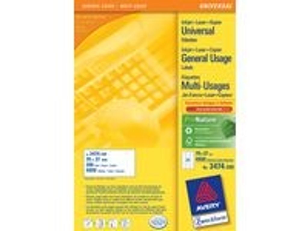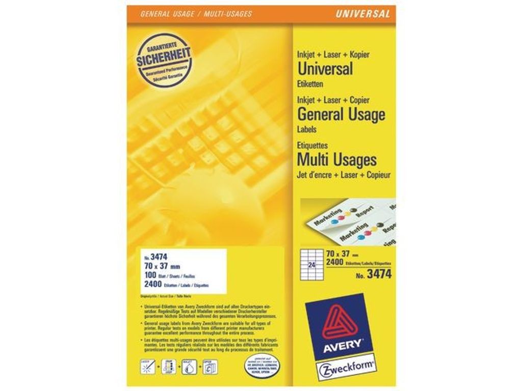 Universaletiketter med Ultragrip för inomhusbruk Har du flera olika typer av skrivare på kontoret? Inga problem, du behöver bara köpa en typ av etiketter – med Averys vita 3474-200 Universaletiketter med Ultragrip för inomhusbruk med 24 etiketter/ark och 4 800 etiketter/förpackning får du etiketter som kan användas i sv/v- och färglaserskrivare, bläckstråleskrivare och kopieringsmaskiner. Du behöver alltså inte vara orolig för om du har lagt etiketter för bläckstråleskrivaren i laserskrivaren. Etiketterna är lämpliga för en rad olika användningsområden där du behöver använda permanent märkning, t.ex. adressetiketter på brev, märkning av föremål eller organisering av mappar. De fäster säkert, tillförlitligt och permanent på alla slags släta ytor. Papperskvaliteten är optimerad så att du får snygga och knivskarpa utskrifter oavsett vilken typ av skrivare du använder. Etikettarken är försedda med vår unika Ultragrip-teknik som har ett unikt tredimensionellt mönster som gör att skrivarna får ett perfekt grepp i arket. Greppområdet säkerställer att skrivarens valsar kan greppa, föra in och styra etikettarket på ett bättre sätt. Det gör att du inte behöver bekymra dig för att etiketterna skrivs ut snett eller fastnar i skrivaren och orsakar stopp. Med Averys universaletiketter sparar du inte bara tid och besvär, de hjälper dig också att bevara miljön då de är FSC®-certifierade och därmed bara producerade av papper från hållbart skogsbruk samt kan återvinnas tillsammans med allmänt pappersavfall. Du kan enkelt - och helt gratis - designa och skriva ut dina Avery-produkter med vår mjukvara Avery Design & Print, som innehåller mallar, grafik och designmöjligheter. Läs mer om mjukvaran här: www.avery.se/programvara - 4800/fp