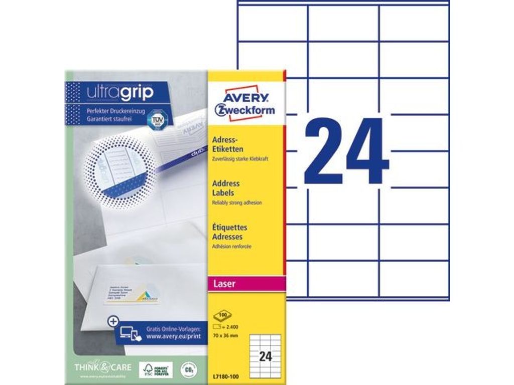 Adressetiketter för brev, paket och försändelserör i alla storlekar. Etiketterna är lämpliga som adressetiketter för brev, paket och försändelserör i alla storlekar. Averys vita L7180-100 etiketter med 24 etiketter/ark och 2 400 etiketter/förpackning är det idealiska valet för den som skickar stora mängder post. Denna förpackning med 100 ark är perfekt för stora etikettuppgifter. De är kompatibla med alla vanliga sv/v- och färglaserskrivare. Den höga papperskvaliteten ger vackra och skarpa utskrifter. Etikettarken är försedda med vår unika Ultragrip-teknik som har ett unikt tredimensionellt mönster som gör att skrivarna får ett perfekt grepp i arket. Greppområdet säkerställer att skrivarens valsar kan greppa, föra in och styra etikettarket på ett bättre sätt. Det gör att du inte behöver bekymra dig för att etiketterna skrivs ut snett eller fastnar i skrivaren och orsakar stopp. De är FSC-certifierade och därmed bara producerade av papper från hållbart skogsbruk samt kan återvinnas tillsammans med allmänt pappersavfall. Du kan enkelt - och helt gratis - designa och skriva ut dina Avery-produkter med vår mjukvara Avery Design & Print, som innehåller mallar, grafik och designmöjligheter. Läs mer om mjukvaran här: www.avery.se/programvara - Antal: 2400/fp