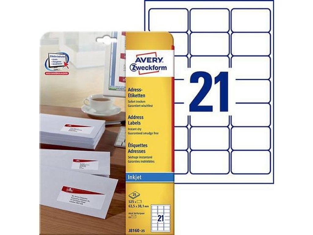 Averys adressetiketter passar för kuvert och mindre paket, och ger en snygg och proffsig känsla för ett bestående intryck när du skickar post till dina kontakter. QuickDRY™ garanterar fläckfria etiketter med din bläckstråleskrivare varje gång, så att du kan fästa adressetiketterna omedelbart. De skrivs ut med knivskarp bild och klara färger, och de är den perfekta storleken för DL-kuvert. Du kan också skapa din egen personliga prägel, till exempel din företagslogotyp, med hjälp av programvarumallar från Avery Design & Print. - Etiketter för alla utgående brev eller paket - Med QuickDRY™-material för fläckfria resultat - Passar för skrivare och kopiatorer med bläckstråleteknik i svartvitt och färg - Skapa dina personliga etiketter med hjälp av den kostnadsfria programvaran Avery & Print Design - Enkel att använda - Form: Rundade hörn - Format: A4 - Totalt antal etiketter: 525 - Mått: 63,5 x 38,1 mm - Färg: Vit