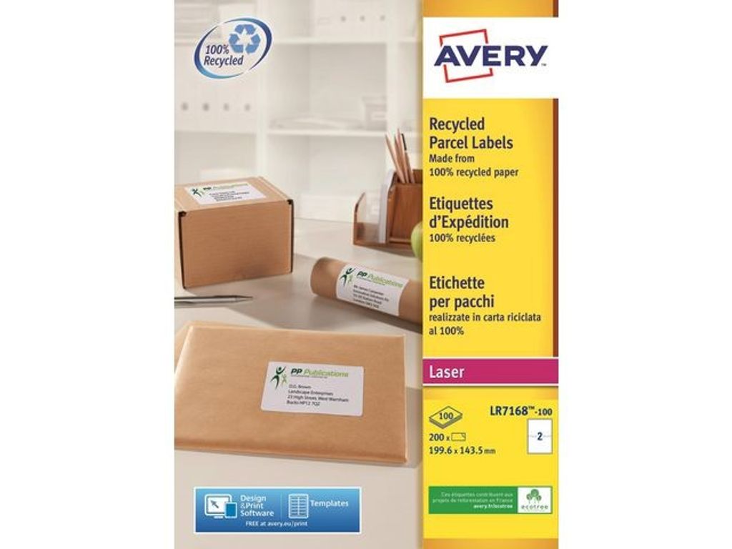 100% återvunna etiketter som ger fina och knivskarpa utskrifter oavsett skrivare. Avery QuickPEEL-etiketter av 100 % återvunnet papper med 2 etiketter per ark och 200 etiketter per förpackning. Tillverkade av 100 % återvunnet papper, har ett vattenbaserat och mer miljövänligt lim samt är förpackade i återvunnen kartong. Produktionen av dessa etiketter är utformad för att undvika onödig avskogning samt förbruka mindre energi och vatten. Averys JamFREE™-garanti säkerställer att du inte behöver bekymra dig för om etiketterna fastnar i skrivaren och orsakar stopp. Med en pålitlig och permanent vidhäftning. På www.avery.se/programvara hittar du massor av mallar som du kan använda för att enkelt och GRATIS designa och skriva ut dina Avery-etiketter. - Mått: 99,6 x 143,5mm - Antal: 200/fp