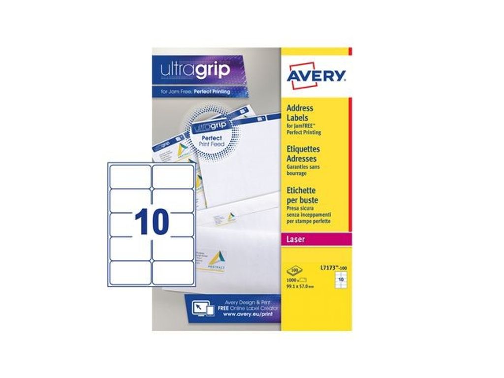 Du har bara två händer, men en ocean av uppgifter på skrivbordet. Och inbjudan till nästa veckas konferens måste gå med posten senast i eftermiddag kl. 16.00 – men hur ska du lyckas göra allt på halva tiden? Stora och små brevutskick blir mycket lättare när du använder Averys vita L7173-100 QuickPEEL ™-etiketter med 10 etiketter/ark och 1 000 etiketter/förpackning. Du behöver bara ta bort den perforerade delen av skyddspapperet för att exponera hörnen på etiketterna så kan du enkelt ta av dem och sätta dem på kuverten. Det ger en avsevärd tidsbesparing eftersom du inte behöver krångla med etiketthörnen – i själva verket upp till 25 % av den tid som du lägger ner om du inte använder QuickPEEL™-funktionen. Naturligtvis kan du även ta av dem på vanligt sätt utan att ta bort den perforerade delen. Denna förpackning med 100 ark är perfekt för stora brevförsändelser, och etikettstorleken passar extra bra till C4/C5-kuvert. De är kompatibla med alla vanliga sv/v- och färglaserskrivare. Den höga papperskvaliteten ger vackra och skarpa utskrifter. Etiketter med förstärkt grepp, ultragrip. Ett unikt 3D-mönster på arken gör att skrivaren kan få perfekt grepp om dem. Tack vare dessa greppzoner kan skrivarvalsarna greppa och mata fram och styra etikettarken ännu bättre. Precisa utskrifter utan pappersstopp garanteras. Etiketterna har en pålitlig och permanent vidhäftning. Etiketterna har en pålitlig och permanent vidhäftning. Med Averys etiketter med QuickPEEL™ sparar du inte bara tid, de hjälper dig också att bevara miljön då de är FSC®-certifierade och därmed bara producerade av papper från hållbart skogsbruk samt kan återvinnas tillsammans med allmänt pappersavfall. På www.avery.eu hittar du massor av mallar som du kan använda för att enkelt och GRATIS kan designa och skriva ut dina Avery-etiketter. - Mått: 99,1x57 mm