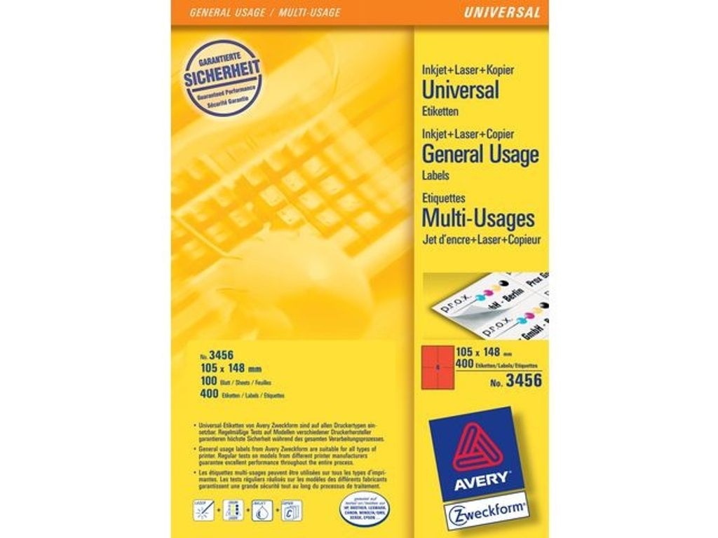 Permanenthäftande färgade etiketter Färgade etiketter får mer uppmärksamhet. Alla företag uppskattar ordning. Ett sätt att skapa ordning är att sortera dina dokument efter färg, t.ex. med Avery 3456 permanenthäftande etiketter med 4 etiketter/ark och 400 etiketter/förpackning: blåa för dina kunders dokument, gula för dina leverantörer, röda för interna dokument osv. Detta innebär att varje medarbetare enkelt och snabbt får överblick över hur saker och ting är organiserade. Du kan också använda etiketterna som säljfrämjande etiketter, för märkning av produkter, emballage och broschyrer eller för att framhäva ny eller särskild information. Kan skrivas ut på alla skrivare, och Averys JamFREE™-garanti säkerställer dessutom att du inte behöver bekymra dig för om etiketterna fastnar i skrivaren och orsakar stopp. - Mått: 105x148mm - Färg: Röd - Idealiska för färgidentifiering på dokument och paket - Kan skrivas ut på alla skrivare