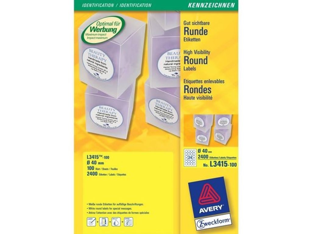 Runda produktetiketter Gratisprover, rabatter och erbjudanden är bara några av de säljfrämjande åtgärder som du kan vidta för att öka din omsättning. Fånga kundernas uppmärksamhet med etiketter i speciella former som är idealiska för reklam och säljfrämjande klistermärken. Oavsett vilken typ av kampanj du driver kan du använda Avery L3415-100 runda produktetiketter med 24 etiketter/ark och 2 400 etiketter/förpackning för att göra etiketter med ditt eget budskap precis när du behöver dem, och i det antal du behöver. Etiketterna är permanenthäftande på alla vanliga ytor som glas, plast, papper osv. – även på krökta ytor. Averys runda produktetiketter kan skrivas ut med alla sv/v- och färglaserskrivare och hjälper dig också att bevara miljön, då de är FSC®-certifierade och därmed bara producerade av papper från hållbart skogsbruk och kan återvinnas tillsammans med vanligt pappersavfall. - Mått: Ø 40 mm - Form: Rund - Bläckstråleskrivare - Färglaserskrivare - Svartvit laserskrivare - Kopieringsmaskin