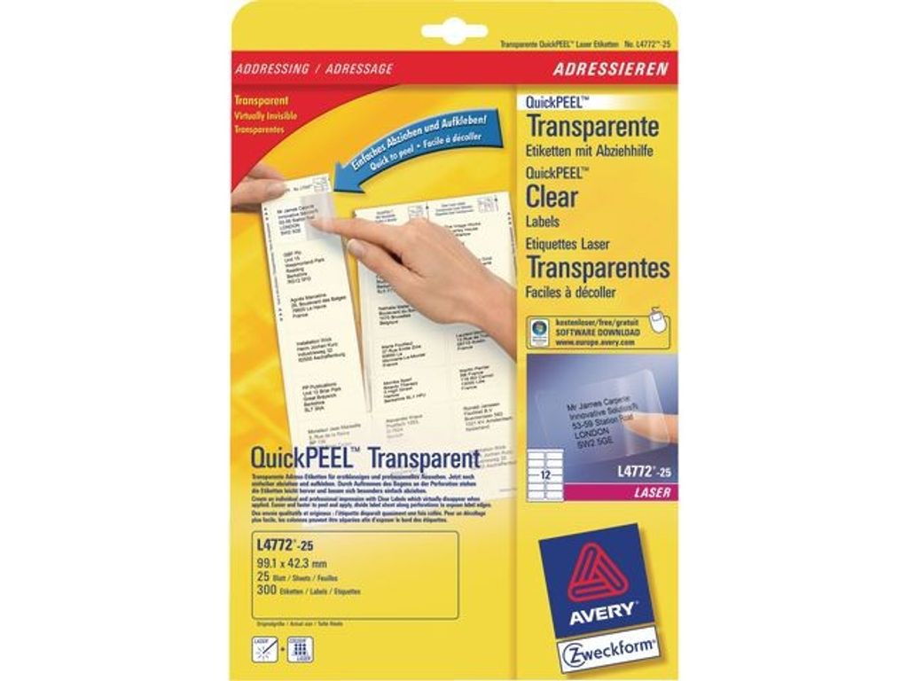 Genomskinliga adressetiketter som ger ett professionellt utseende på dina kuvert eller mindre paket. Tillverkade av polyester och innehåller QuickPEEL-teknik, vilket ger dig möjlighet att fästa etiketter snabbt. Dela bara upp etiketterna på arket längs perforeringen för att exponera etikettens kanter för att sedan dra och fästa. Det gör märkningen av din post så mycket snabbare. De skrivs ut med en knivskarp bild och klara färger och du kan även skapa din egen personliga prägel på etiketterna med hjälp av programvarumallar från Avery Design Print. Du hittar dem på avery.se/programvara. - Mått: 99,1x42,3mm - Limtyp: permanent