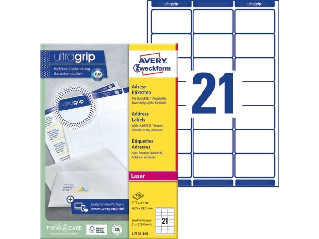Adressetiketter utformade för att sitta fast och är utskrivbara i svartvitt eller färg. Ger ett professionellt utseende på dina kuvert eller mindre paket. JamFREE-garantin säkerställer att etiketterna smidigt behandlas i skrivaren och tack vare QuickPEEL-tekniken går det snabbt att fästa etiketter vilket gör märkningen av din post så mycket smidigare. De skrivs ut med en knivskarp bild och klara färger. Du kan även skapa din egen personliga prägel på etiketten med hjälp av programvarumallar från Avery Design som du hittar på avery.se/programvara. - FSC®-certifierade - Mått: 63,5x38,1 mm