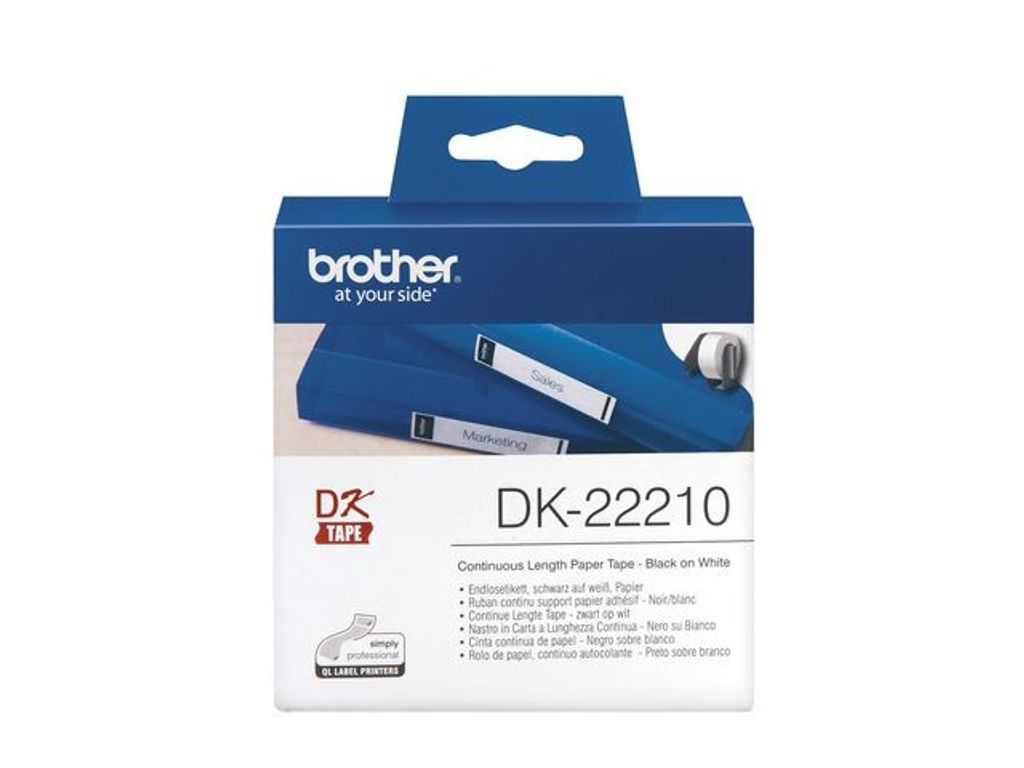 Beskrivning av Etikett BROTHER DK22210 29mmx30,48m Brother original papperstape av hög kvalitet Etiketter till Brother etikettskrivare. 29 x30,48 mm.