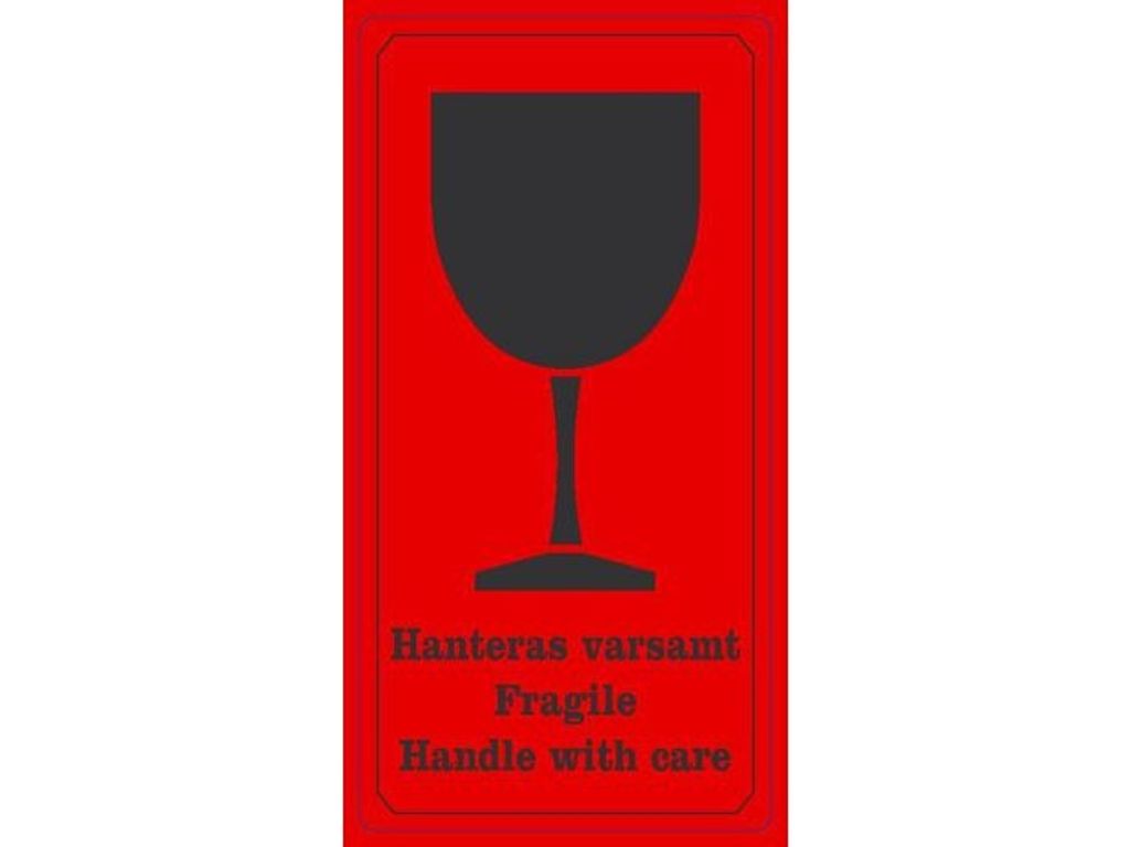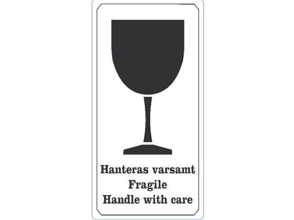 Självhäftande etiketter förtryckta med texten ”Hanteras varsamt, Fragile, Handle with care” samt bild på ett vinglas. Med dessa etiketter så hjälper man till och säkerställer att godset/paketet hanteras varsamt. Etiketten har en mycket synlig bild och en text på både svenska och engelska. Varje etikett är förtryckt med orden 'Hanteras varsamt, Fragile, Handle with care' med fet text. Rullformen och den självhäftande baksidan gör etiketterna lätta att dra av och fästa på olika slags material, förpackningar eller behållare för ökad säkerhet under transport. - Mått: 70 x 120mm - Antal: 1000 ark per rulle