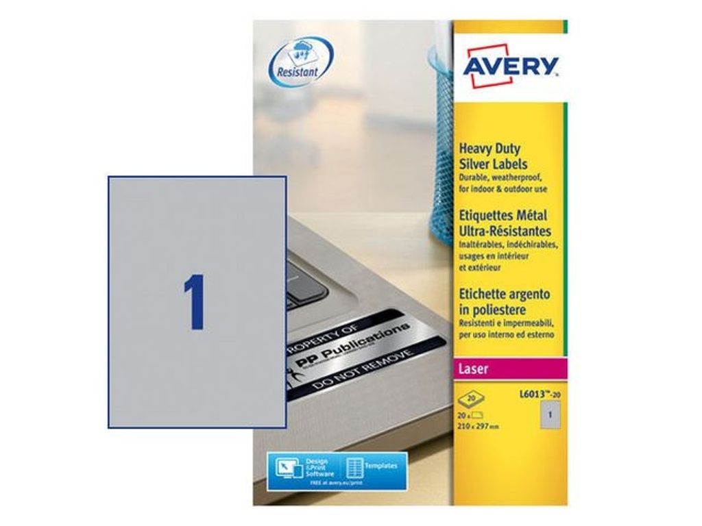 Vita, slitstarka etiketter perfekta för hållbar och permanent märkning av IT-utrustning, mobila enheter, verktyg, inventarier m.m. Tåliga och slitstarka etiketter från Avery. Vädertåliga och tuffare än vanliga pappersetiketter med en extra stark vidhäftning. Tål vatten, olja, smuts, UV-strålar och extrema temperaturer (–40 °C till +150 °C). Perfekta för att märka små elektroniska komponenter eller större maskiner med företagets logotyp eller ID-kod. De har en filmbeläggning och ger en tydlig och skarp finish på dina utskrifter. Lämpar sig för utskrift i de flesta svartvita laserskrivare och du kan enkelt skapa din egen personliga touch med hjälp av mallarna i programvaran Avery Design & Print som du hittar på avery.se. - Format: A4 - Totalt antal etiketter: 20 - Mått: 210 x 297mm - Färg: silver