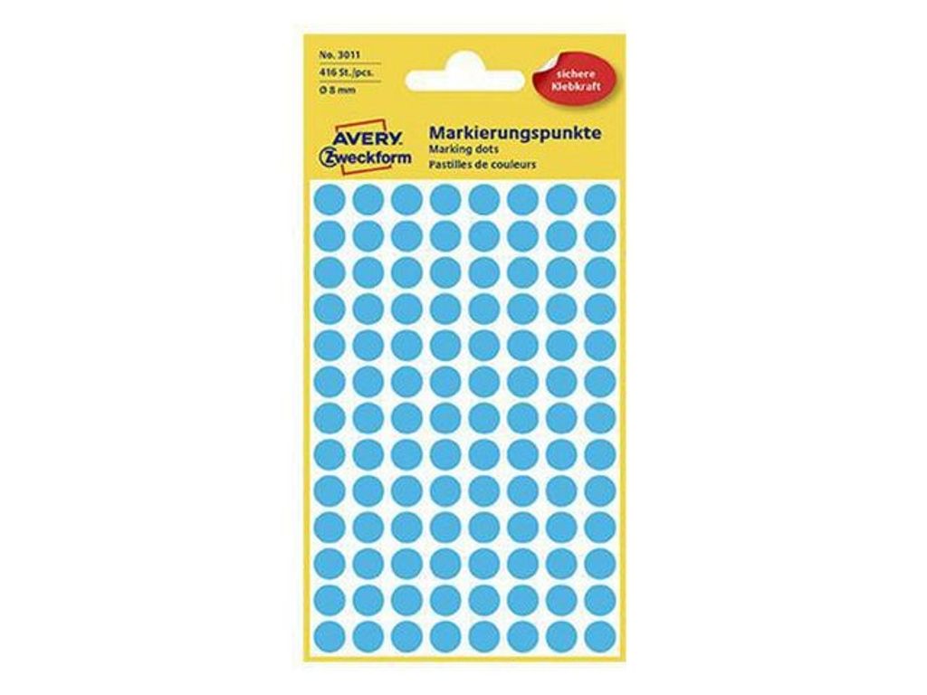 Praktiska färgkodningsprickar som skapar ordning och överblick över mappar, handlingar, dokument, registerkort m.m. Är även utmärkta för att markera t.ex. avreseplats, destination och potentiella övernattningsställen på kartan eller för att markera deadlines och datum i projektplaner, böcker eller vid intern semesterplanering på kontoret. - Avery produkt 3011 - Etikettformat: Ø8mm - Färg: Blå