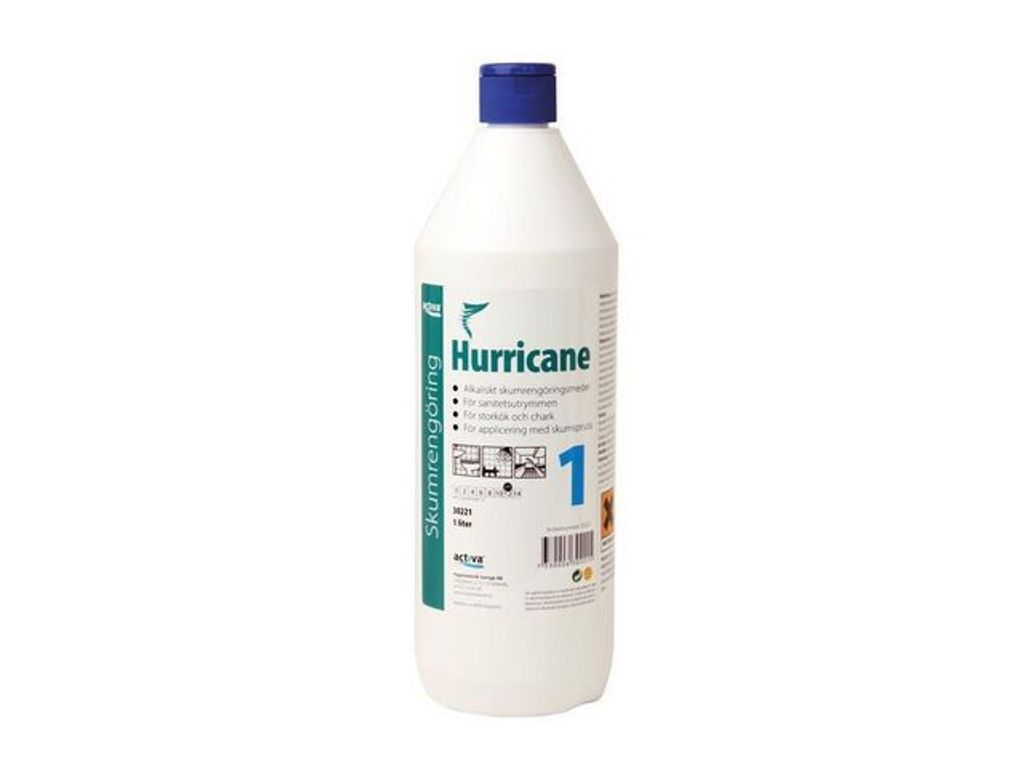 Avlägsnar fett snabbt och smidigt! Ett avfettande rengöringsmedel speciellt framtaget för applicering med skumspruta. Skumbildningen gör att produkten hänger kvar längre på vertikala ytor och hinner verka. Hurricane löser effektivt tvålrester, fett och smuts. Används endast i skumsystem. Parfymerad. Activa Hurricane ska användas som första steg för att lösa fett, tvål och hudrester i duschar och olika typer av fett i storkök. Efter Activa Hurricane ska Activa Storm användas för kalklösning. - pH-värde: konc. ca 12, bruksl. ca 10,5Svag doft - Dosering: Sprayflaska: 20 ml till 10 liter vatten. Skumspruta: 1%-2,2% beroende på vattenhårdhet. 1%=Lila, 1,4%=Turkos, 2,2%=Brun doseringsplugg - Utseende: Ofärgad vätska - Volym: 1 L