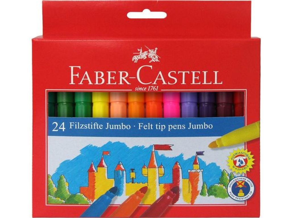 Fiberpenna Jumbo med spets som tål 3 kg tryck, tvättbar från de flesta textilier. - CE certifierad = giftfritt innehåll & färgämne - Etui med 24 färger Varning. Lämpar sig inte för barn under 3 år
