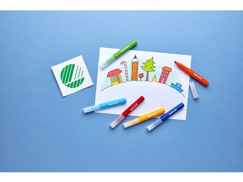 Penol Jumbo Fiberpennor. Svanmärkning. 10 st olika färger med vattenbaserat bläck. Tjocka med broad spets. Lämpliga för barn över 3 år. - Ventilerad kork - Rund spets broad - Linjebredd: 2-4 mm - Mått pennkropp: diam16mm längd 139mm - Antal per fp: 10 - Svanen: Licensnummer 50570008