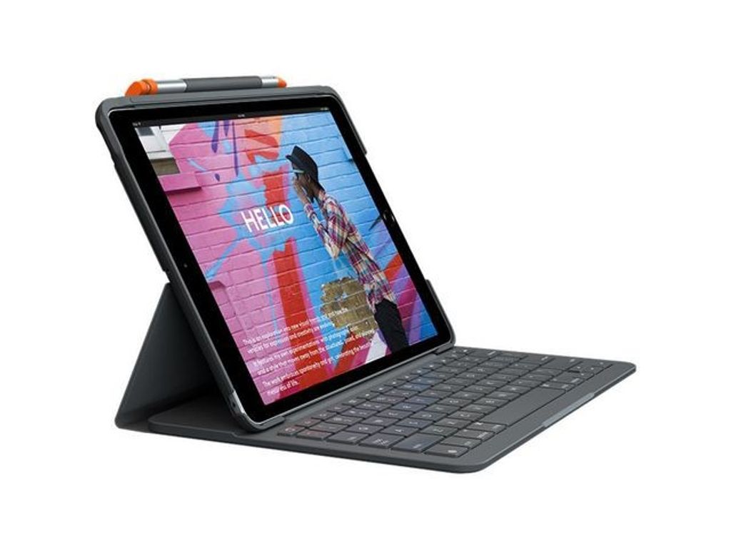 Fodral och tangentbord samlat i en och samma produkt! Logitech Slim Folio - tangentbord och foliefodral - Pan Nordic - grafit. - Typ av enhet: Tangentbord och foliefodral - Gränssnitt: Bluetooth - Inmatningsenhet: Tangentbord - Layout: Pan Nordic - Snabbtangentsfunktion: Sökning, stänga av ljud, spela upp(paus, föregående spår, nästa spår, startskärmbild, Siri, volym -, volym +, språktangent - Skydd: Reptålig, spillbeständig - Färg: Grafit - Fodralmaterial: Plast, tyg - Dimensioner (BxDxH): 24.8 cm x 2 cm x 18.2 cm - Vikt: 445 g - Designat för: Apple 10.2-inch iPad (7:e generation)