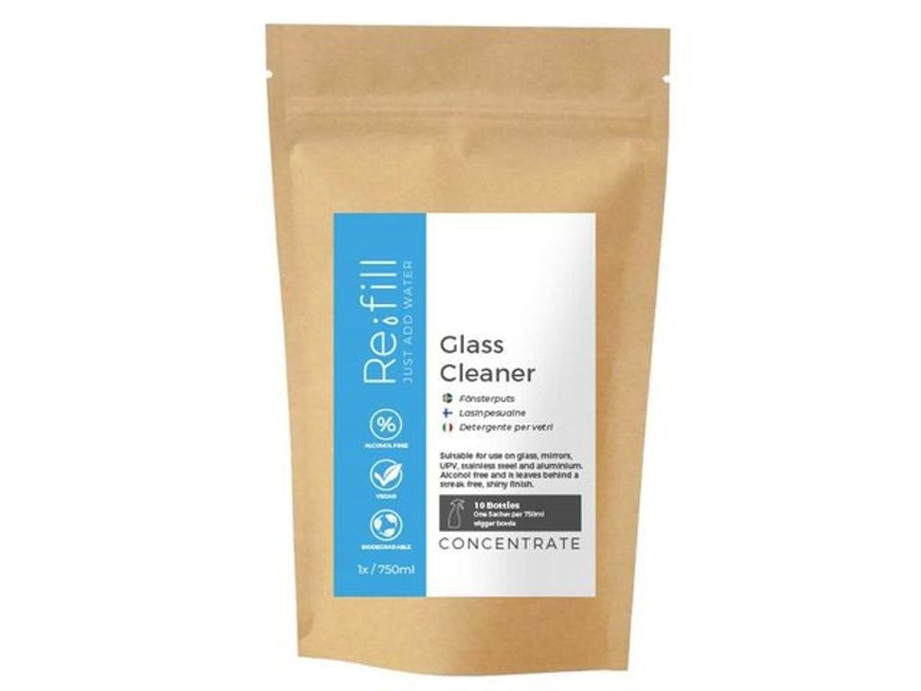 Just add water! Eliminera användningen av engångsplast - tillsätt bara vatten. Rengöringskoncentrat för professionell städning. Re:fill Fönsterputs passar utmärkt för all typ av rengöring av fönster, speglar, glas, plast, aluminium och rostfritt stål, även i köksutrymmen. Den lämnar en blank yta utan streck. Fri från alkohol, ammoniak och även fri från doft. Välj ett hållbarare alternativ för en plastfri städning, där du återanvänder flaskan. Minska även transportmängden och spara lagerutrymme. Koncentratet finns i vattenlösliga kapslar. Varje påse innehåller 10 st kapslar. Varje kapsel är exakt doserad för att ge 750ml färdig lösning. 1. Fyll upp flaskan med vatten. 2. Lägg i kapseln, 3. Skaka, 4. Rengör. Samtliga produkter i Re:fill serien framställs av över 90%+ naturliga ingredienser. Tillverkningen sker med hållbarhet i fokus och etiskt utan djurförsök. Certifierad av The Vegan Society Flaskan på 750ml säljs separat och kommer med en dubbelmunstycke för applicering som spray eller skum. Kom ihåg att spara och återanvända flaskan. - 100% återvinningsbara förpackningar - Eliminerar användningen av engångsplast - pH-värde: ca. 9, 5% lösning - Lukt: Parfymerad - Utseende: Blå tabletter