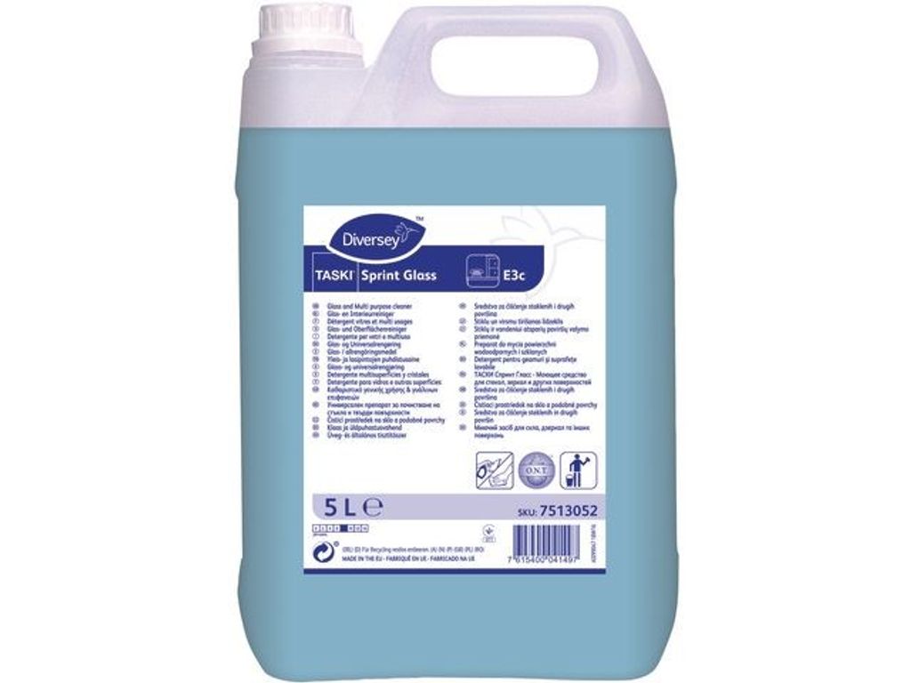 Beskrivning av Fönsterputs TASKI Sprint Glass 5L Fönsterputs för rena glasytor! Rengöring av alla typer av glasytor. Bruksfärdig, parfymerad, färgad. Ej ammoniak. - pH: ca 7 - Lätt parfymerad - Dosering: Brukslösning som används outspädd - Utseende: Klar, blå vätska