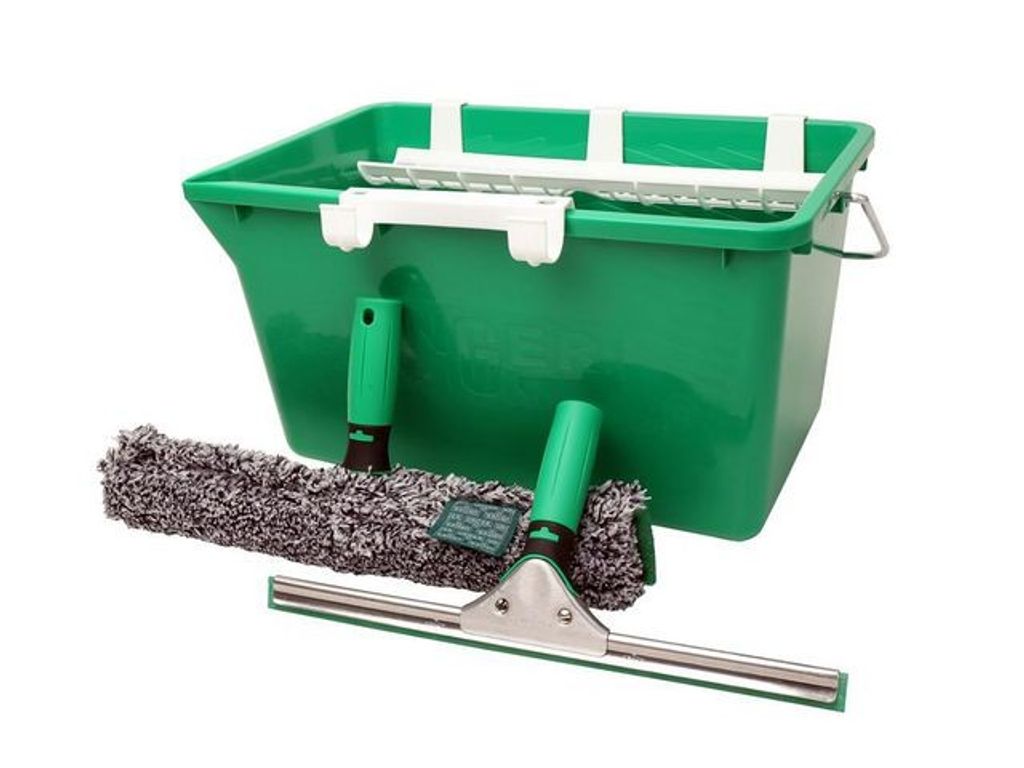 Beskrivning av Fönsterputsset UNGER grön Startkit fönsterputsning, komplett med det som behövs för att rengöra fönster. Innehåller hink, pälshållare, tvättpäls, handtag, skena med gummi. - Mått redskap: 35cm - Mått hink: L43xB26xH23,5cm