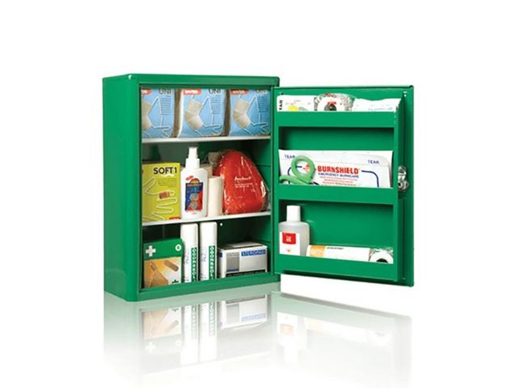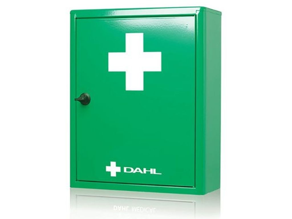Första Hjälpen-skåp med vred. Grönlackerat, kraftigt och stilrent. Innehåller det som behövs vid akuta situationer samt daglig förbrukning. Innehåll: 3x Snögg Tryckförband 1m 1x Snögg Fingerförband 5m 2x Ögonskölj 45ml 1x Burnshield kompress 20 x 20cm 1x Burnshield gel 125ml 1x Alcogel 150ml 1x Elastoquick 3cm 1x Elastisk binda 8cm 1x Elastisk binda 10cm 25x Sterila kompresser 5 x 5cm 1x Andningsmask 1x Universalsax 1x Pincett 10x Sårtvättar 18x Suturtejp 2x Tygplåster 50-pack 1x Zinkhäfta 6x Handskar nitril 10x Hygienservett - Material: Plåt - Färg: Grön - Storlek: 42 x 34 x 13 cm