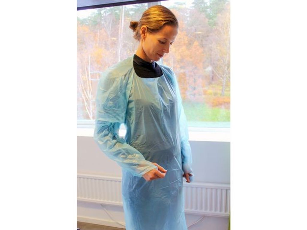 Beskrivning av Förkläde 980x1250mm lång ärm blå 20/fp Ett CE-certifierat förkläde med lång ärm för engångsbruk. Förkläde i Cast polyeten med lång ärm och tumgrepp. Löspackat i påse. - Mått: 98x125cm - Tjocklek: 20 my - Material: CPE - Färg: Ljusblå