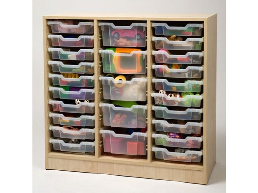 Förvaringshylla med backar. Levereras med 20 st låga och 5 st höga, transparenta backar av kraftig PP-plast. Levereras färdigmonterad. Stadig konstruktion av lönnmelamin och sockel. Kraftiga plastskenor som passar alla backstorlekar. Storlek på förvaringshylla: B104 x H100 x D45 cm. Backstorlek: B31 x H7,5 x D43 cm och B31 x H15 x D43 cm.