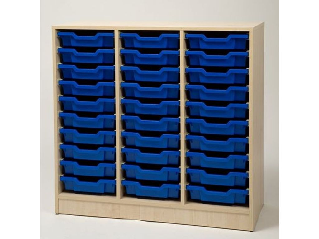 Förvaringshylla med backar. Levereras med 30 st blåa, låga backar av kraftig PP-plast. Levereras färdigmonterad. Stadig konstruktion av lönnmelamin och sockel. Kraftiga plastskenor som passar alla backstorlekar. Storlek på förvaringshylla: B104 x H100 x D45 cm. Backstorlek: B31 x H7,5 x D43 cm.