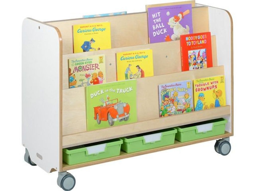 Beskrivning av Förvaringshylla bokvagn GROCARE, vit Bokvagn GROCARE 2 sidig bokvagn i vit högtryckslaminat. Mått: B 105 x H 78 x D 45,5 cm. Gröna plastlådor, 134665 medföljer inte utan säljs separat.
