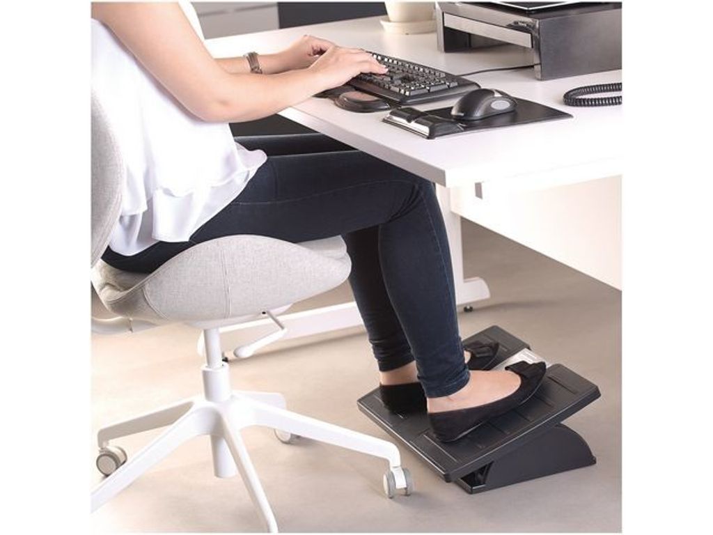 Förhindra smärta i ben och rygg med Fellowes® Office Suites™ Microban® justerbart fotstöd Genom att använda rätt hållning på din arbetsplats kan du undvika smärta i ben och rygg med hjälp av Office Suites™ Microban® justerbart fotstöd från Fellowes®. Med inbyggt Microban®-skydd som hämmar tillväxten av bakterier och ökar produktens livslängd, vilket ger en ren, sund arbetsplats. Justera enkelt fotstödets position genom att trycka på det med foten, så stannar det kvar i detta läge tills det justeras igen på samma sätt. Stimulera blodflödet och öka cirkulationen med fram- och tillbakagående rörelser för att minska smärta i benen och för att stimulera fotlederna. - Justerbart fotstöd för daglig användning - Inbyggd Microban®-teknik som hämmar tillväxten av bakterier och ökar produktens livslängd - Justera fotstödets position med ett enkelt tryck med foten - Stimulerar blodflödet till benen, motverkar trötthet och förhindrar ryggbesvär - Mått: 111,1 mm x 444,5 mm x 333,4 mm - Färg: svart och silver - Ackrediterad av FIRA, en oberoende ergonomisk ackreditering