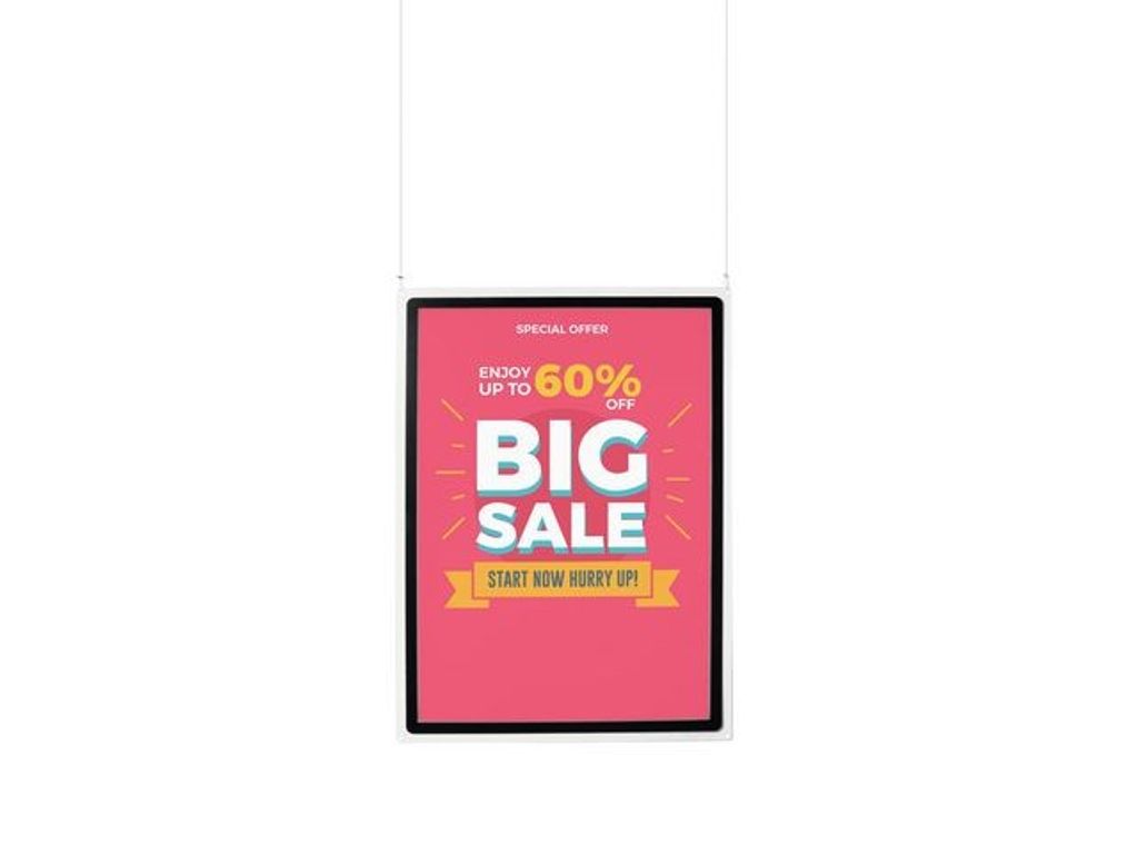 Elegansen i vår Magneto-ramficka förstärkt med en robust akrylhållare. Visa affischer och skyltar med lätthet och maximal synlighet. Kristallskylthållare - stort format - A1 Magneto displayficka - stående / landskap - svart. Hängande akrylskylthållare i stort format med en Magneto displayram. Bländfri ficka med 3-sidig magnetförslutning. Designad för att innehålla A1-visningslitteratur. Kan hängas vertikalt eller horisontellt. Sidoöppning. Levereras med 2,5 m snöre, öglor och takkrokar. Dubbelsidig ficka. Ramens unika och exklusiva 'dot' -design fokuserar dokument fram och bak. Snabb och enkel dokumentändring. Dokumentet är fokuserat och mycket synligt. Skylthållaren kan justeras till olika takhöjder. Osynlig upphängning tack vare transparent sladd. För inomhusbruk. Designad för affischer och skyltar i stort format. Perfekt för skyltning i stora utrymmen i stormarknader, köpcentra, byggnadslobbyer, fabriker, museer, mässor, utställningar etc. - Mått: 676 x 923 mm - Material: PMMA-hållare med PVC-ficka - Monteringsfäste: Upphängningssnöre av nylon samt öglor av mässing med förnicklad yta - Tillverkad i Frankrike