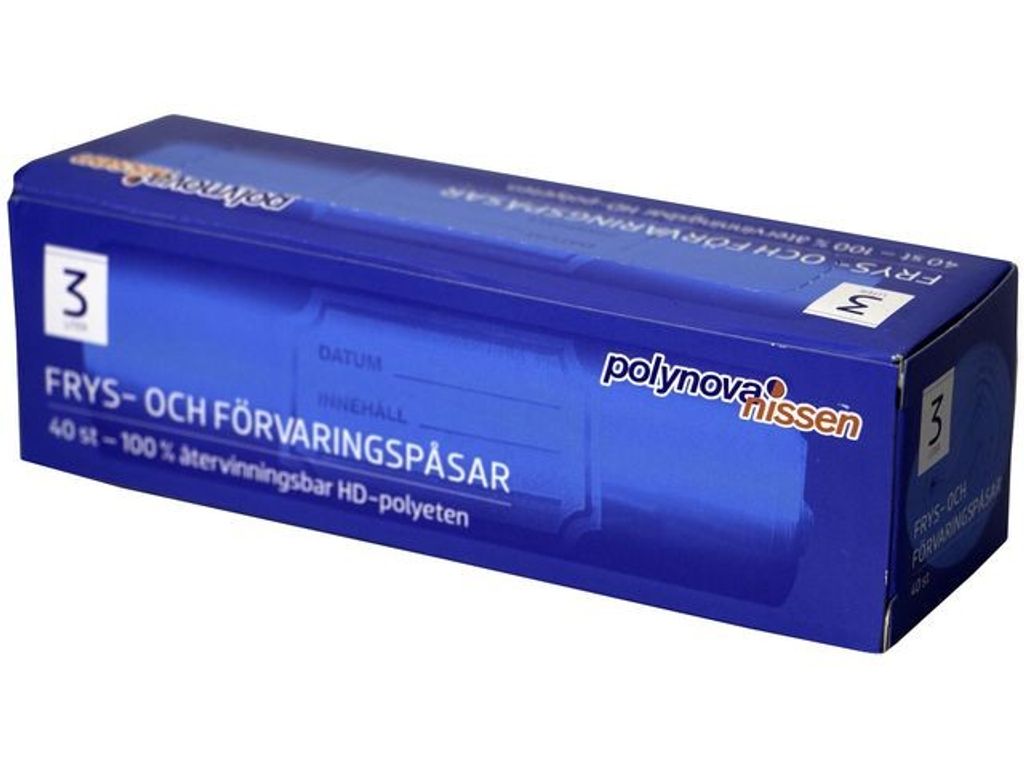 Polynova-fryspåsar på rulle är tillverkade av högkvalitativ högdensitetspolyeten (HDPE) och är lämpliga för förvaring av fryst mat på ett säkert sätt. Använd fryspåsar från Polynova på rulle för att förvara kött eller grönsaker så att de behåller sin färskhet. Fryspåsarna är förpackade i rullar för enkel avrivning och du kan även förvara dem prydligt. De är tillverkade av HDPE, vilket är 100 % återvinningsbart och säkert att kassera. Dessutom kan du använda dem för att marinera kött eller göra så att tärnad frukt och matrester håller längre. Aromtäta, transparenta HD-påsar med skrivfält på rulle i praktisk konsumentförpackning. För förvaring och infrysning av olika livsmedel. - Lämplig för förvaring av fryst kött, grönsaker eller frukt - 100 % återvinningsbar - Antal: 40st - Volym: 3L - Tjocklek: 15my - Färg: transparent - Mått: 150/100 x 400mm - Material: HDPE