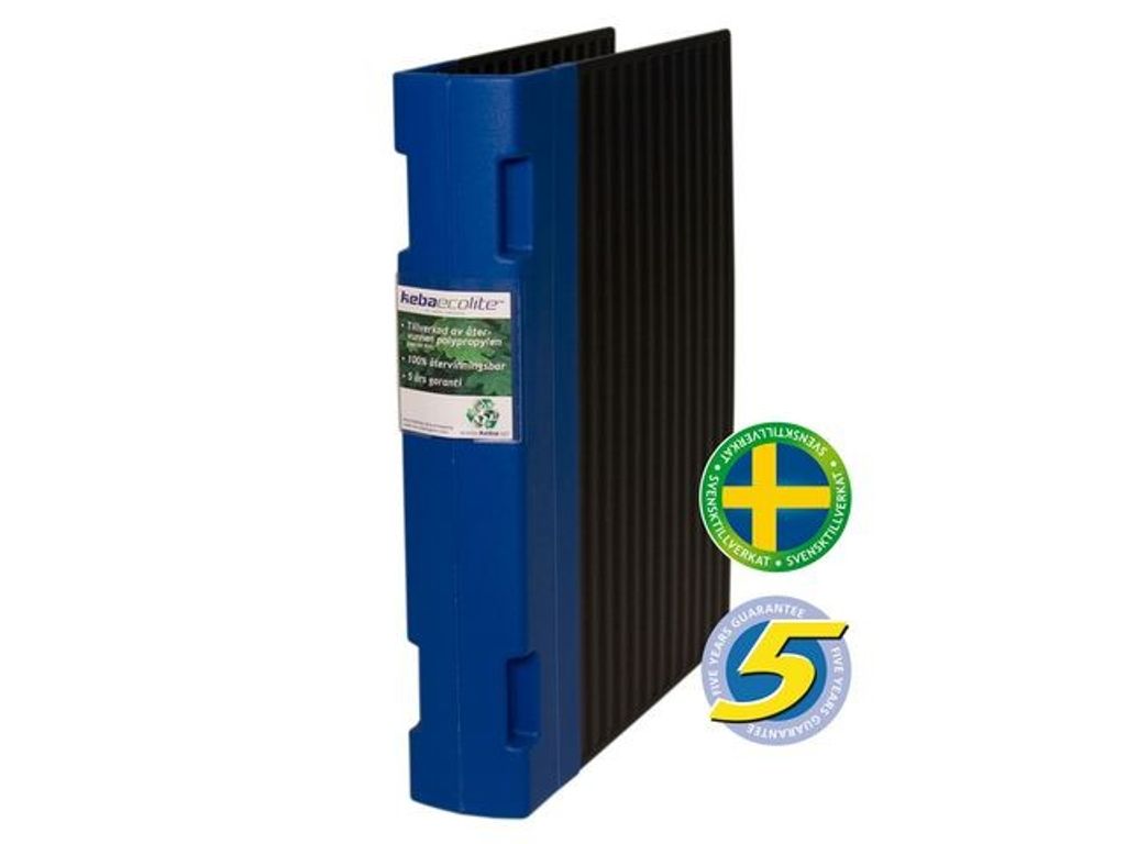 Tillverkad i 95% återvunnen polypropylen plast. Kan återvinnas utan demontering, då den är tillverkad helt och hållet i PP-plast. Patenterad mekanism i plast för enkel och säker användning. Den är lätt och smidig i modern design. Etikettmallar finns på www.keba.se. Svensktillverkad, 5 års garanti. 20 st/förp. A4, helrygg 55 mm, blå/svart.