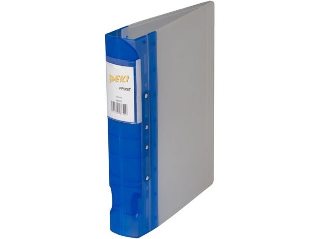 Beskrivning av Gaffelpärm PEKI frost A4 56mm blå Vit A4-pärm med 4 ringar och 56 mm rygg. Solid PP-pärm. Gaffelpärm med mekanism som öppnas med ett enkelt tryck. Matt, transparent rygg med etikettficka och grepp för att du enkelt ska kunna fatta tag om pärmen.