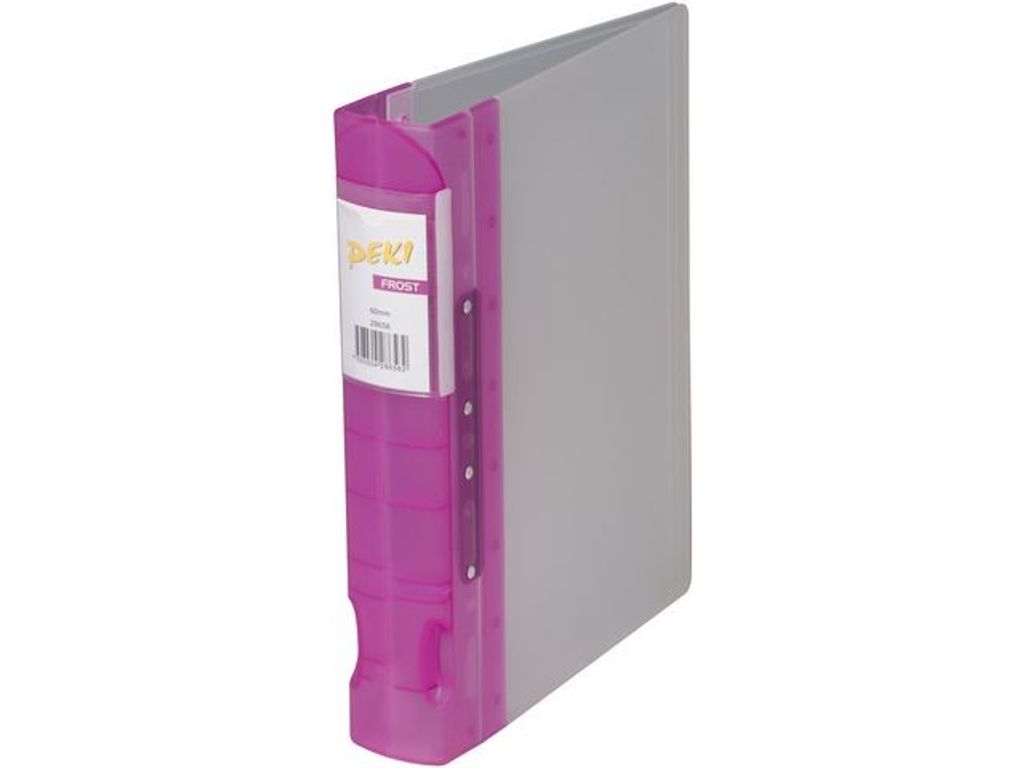Beskrivning av Gaffelpärm PEKI frost A4 56mm lila Vit A4-pärm med 4 ringar och 56 mm rygg. Solid PP-pärm. Gaffelpärm med mekanism som öppnas med ett enkelt tryck. Matt, transparent rygg med etikettficka och grepp för att du enkelt ska kunna fatta tag om pärmen.