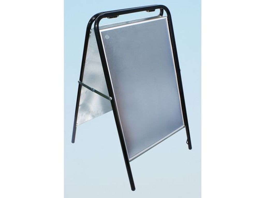 Ett snyggt och stabilt gatuställ som passar både inomhus och utomhus. Gatuställ i format 50x70cm (ark format) med 25mm svartfärgade stålrör som är fosfat och polyesterlackerade, aluminiumförzinkad skyltplatta. Levereras med magnetförsedd frontplast av PET. - Färg: Svart - Höjd: 94cm - Bredd: 58cm -