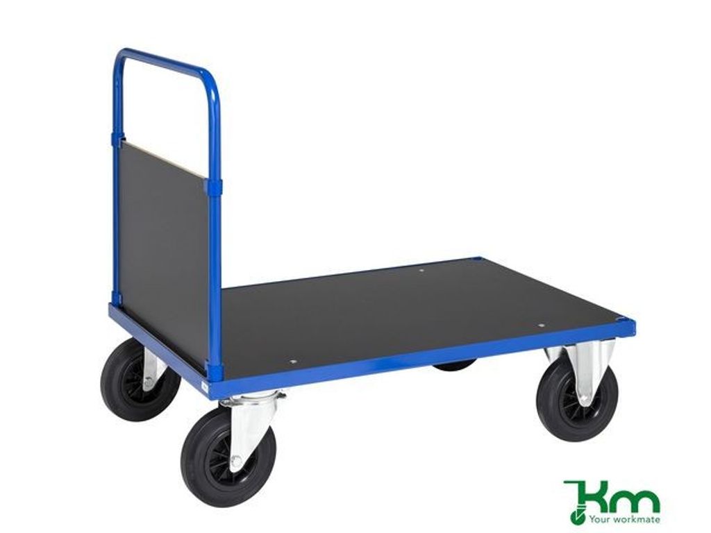 Robust men smidig gavelvagn med handtag. En praktisk vagn med gedigna gummihjul och en gavelskiva i laminat med höjden 400 mm. - Belastning: 500kg - Storlek: 1200x800x900mm (LxBxH) - Höjd till lastplan: 260mm - Byglar: 25mm stålrör - Färg: Blå/MDF, svart - Vagnens vikt: 32,5kg - Bromsade hjul: Nej - Hjultyp: 2 fasta, 2 länk massiva gummihjul 200x50mm