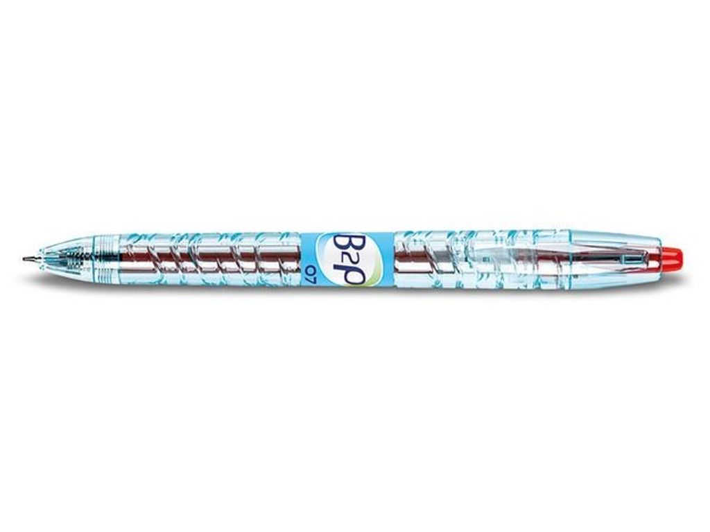 Pilot B2P Gel är formad som en vattenflaska och är tillverkad i 89 % återvunna material. Bli mer miljömedveten och njut av att skriva med B2P-pennan (bottle to pen), den första pennan tillverkad av återvunna plastflaskor. B2P-gelpennan har en pennkropp som är utformad som en plastflaska, utsmyckad med snygga mönster och en genomskinlig blå pennkropp som visar bläcknivåerna så att du inte får slut på bläck helt plötsligt. Varje Gelpenna är designad med en mjuk 0,7 mm kulspets för enkel och noggrann skrivning. Den har modernt gelbläck som ger fylliga, starka färger i jämna och fina drag. För ytterligare bekvämlighet kan penna enkelt fyllas på med Pilot-pennrefiller. - Tryckmekanism - Spetsbredd: 0,7 mm - Skrivfärg: Röd - Färg pennkropp: Transparent - Utbytbar patron - Tillverkad av 89 % återvunnen plast