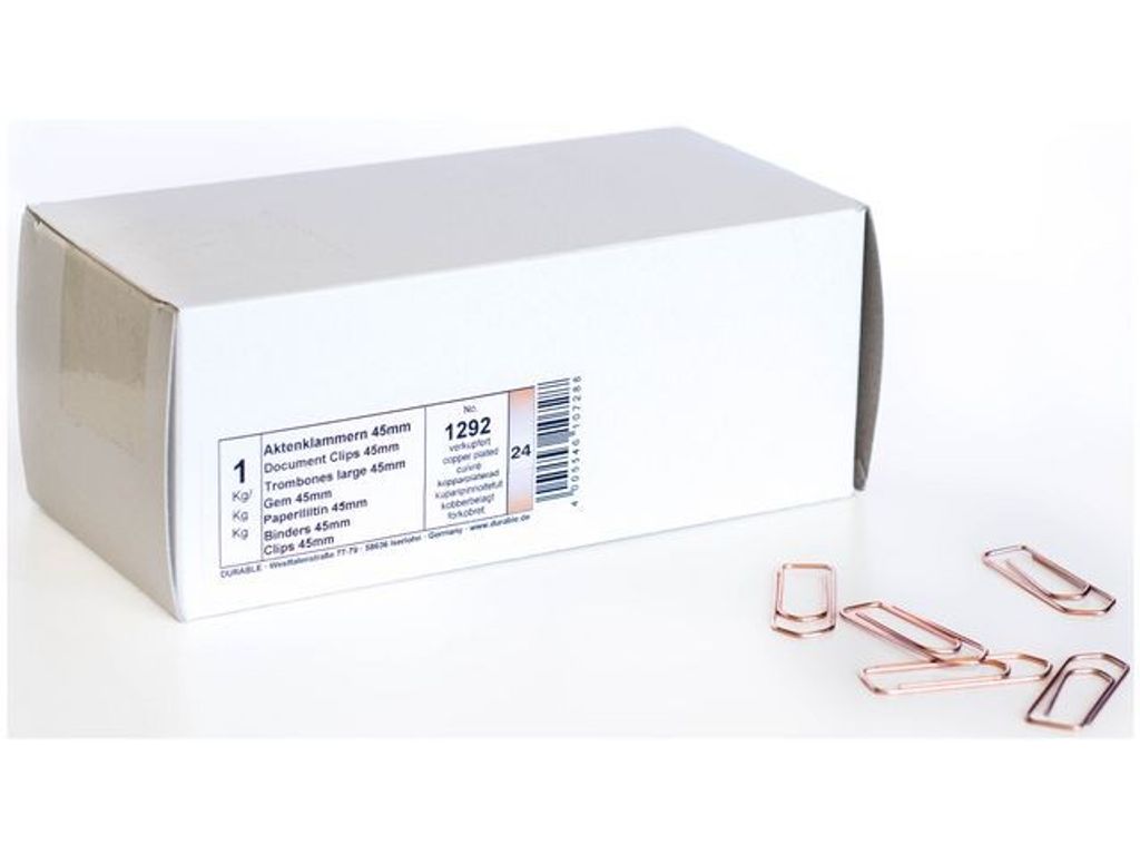De här 45 mm kopparbelagda pappersklämmorna från Durable är ett smart sätt att hålla ordning på rapporter, räkningar eller skolarbete. Med dessa kopparbelagda pappersklämmorna från Durable blir det ett enkelt sätt att bunta ihop dokument utan permanenta häftklamrar. Det här paketet med pappersklämmor är perfekt att ha till hands på kontoret, hemma och i skolan. Den klassiska designen ger ett tillförlitligt grepp och håller ihop papper snyggt och prydligt. - Håll ordning på pappersarbetet utan häftklamrar - Klassiska pappersklämmor i metall - Idealisk för hemmet, kontoret och skolan - Färg: Kopparbeläggning, nickelfri - Mått: 45 mm - Antal: 715 st
