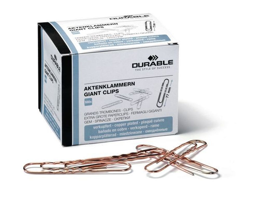 Bunta ihop dokument utan att behöva häfta med de här kopparbelagda pappersklämmorna från Durable. Fyll på med de här kopparbelagda pappersklämmorna från Durable – ett enkelt sätt att bunta ihop dokument utan permanenta häftklamrar. Det här paketet med pappersklämmor är perfekt att ha till hands på kontoret, hemma och i skolan. Den klassiska designen ger ett tillförlitligt grepp och håller ihop papper snyggt och prydligt. De här extra stora 77 mm kopparbelagda pappersklämmorna från Durable är ett smart sätt att hålla ordning på rapporter, räkningar eller skolarbete. - Håll ordning på pappersarbetet utan häftklamrar - Klassiska pappersklämmor i metall - Idealisk för hemmet, kontoret och skolan - Färg: Kopparbeläggning - Material: Metall med nickelfri kopparbeläggning. - Mått: 77 mm - Antal: 100