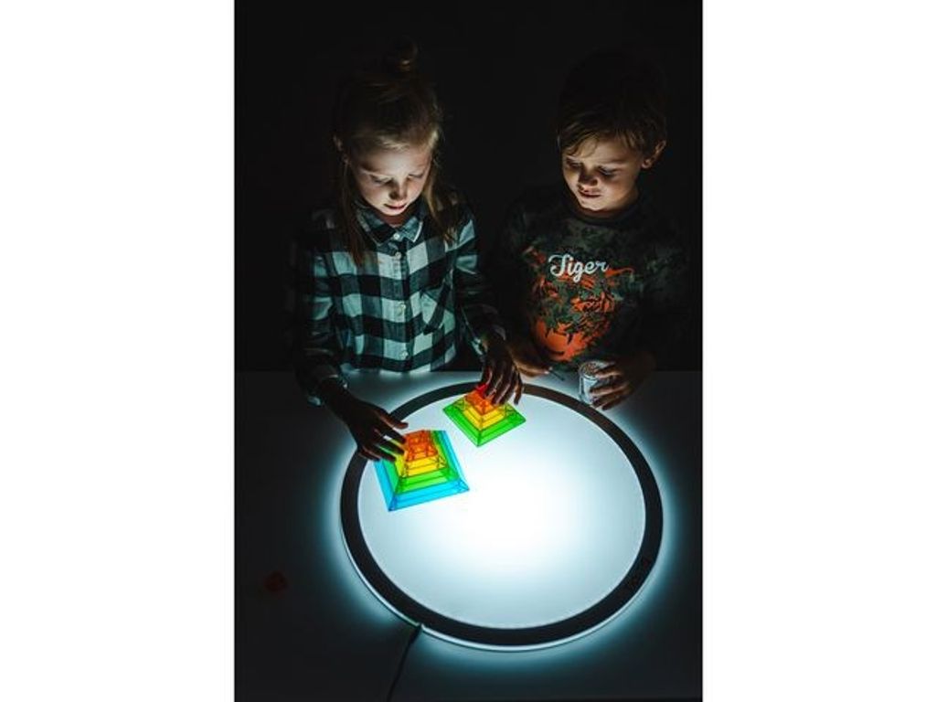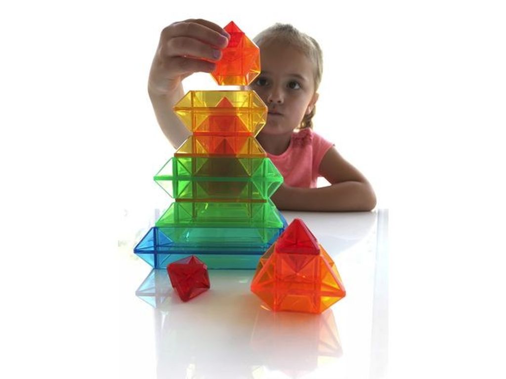 En fantastisk geometrisk resurs som lyser upp ett barns kreativitet! Ett utmärkt redskap för att barn ska lära sig och förstå olika strukturer och former. 15 stycken genomskinliga färgade bitar magsamformas när de staplas, kapslas eller samlas. Mycket bra att använda på ett ljusbord och barn kommer att älska att upptäcka en oändlig mängd färgglada former och mönster. - Innehåller: Häfte som visar över 100 färgglada mönster och former - Storlek på största biten är 13x13x3.5 cm - Tillverkad av: Styrenplast - Rekommenderad från: 3+ år
