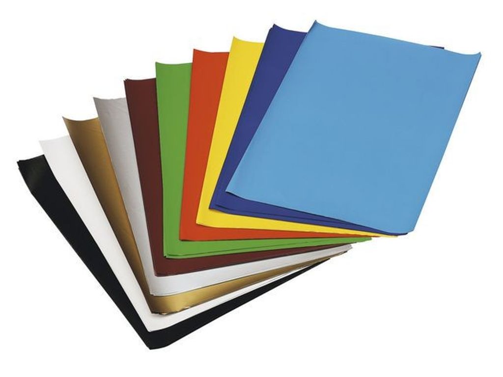Enkelsidigt glanspapper, med gramvikt 85g. 30 x 50 cm. 5 ark x 10 färger: Mörkröd, gul, vit, ljusblå, mörkblå, grön, brun, svart, guld och silver.