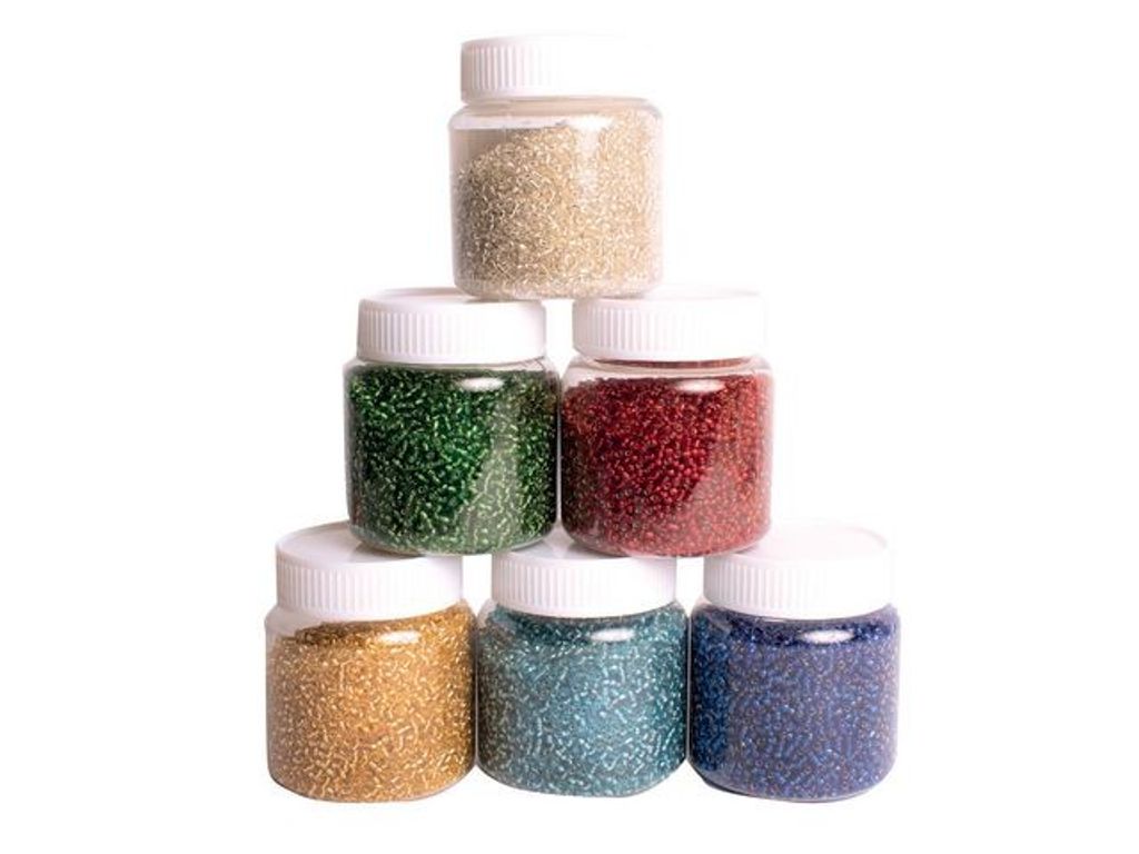 Glaspärlor rocaille i sköna färger, samlade i praktiska burkar. Låt fantasin flöda och skapa fina armband, halsband eller varför inte sy fast pärlorna på valfritt underlag. Kreativt pyssel på egen hand eller tillsammans med andra. - Mått Ø: 3mm - Hål-Ø: 1mm - Färger: guld, turkos, röd, vit, grön, blå - Material: glas - Antal totalt: 1.2kg/fp (200g per färg)