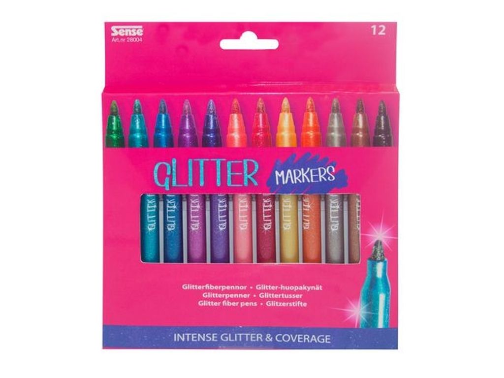 Ett storpack med hela 12 stycken intensivt gnistrande glitterfiberpennor. Passar perfekt för att skriva, rita och dekorera. Pennorna har ventilerade huvar för att undvika kvävningsrisk, samt blockerade spetsar för att udden inte ska tryckas in vid lite hårdare tag. - Kemiskt utvärderade och godkända enligt de högt ställda kraven i Svensk och Europeisk lagstiftning Varning. Lämpar sig inte för barn under 3 år