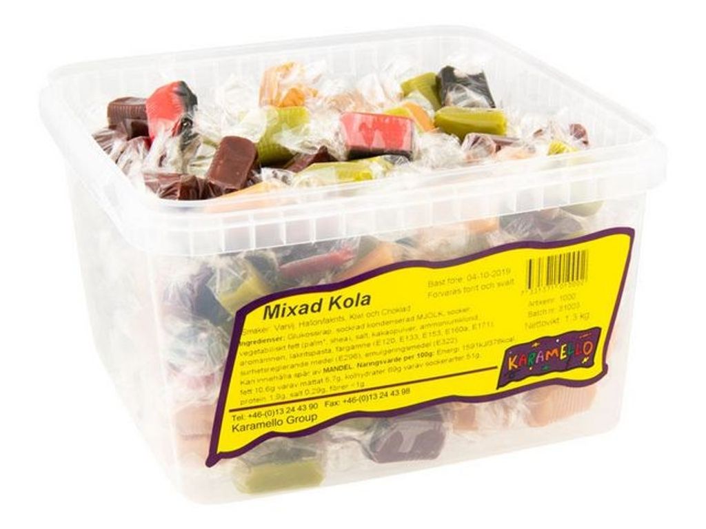 Olika inslagna kola-klassiker! Smakrika och riktigt, riktigt goda! Perfekta att ha i lunch-och fikarummet, på möten för en extra energiboost eller i receptionen för att bjuda kunder och gäster? Smart inslaget vilket resulterar i en hygienisk hantering. Mixad kola: gräddkola, hallon/lakrits och choklad. - Inslagna kolor i plastburk - Gräddkola, hallon/lakrits och choklad - 1kg