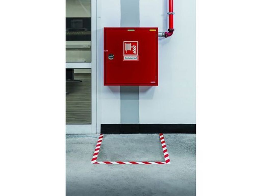 Självhäftande röd-vit randig markeringstejp för inomhusbruk. Används för permanent markering av riskområden som behöver uppmärksammas t ex trafikzoner och spärrområden. Golvmarkering DURALINE® 30m röd/vit fäster på rena och torra betonggolv. Halkskyddsgrad R9 i enlighet med DIN51130. Röd / vit varseltejp används för brandskyddsvägar och annat som rör brandskydd. - Mått (B x L): Rulle om 30 m, 50 mm bred, tjocklek 0,7 mm - Färg: röd/vit
