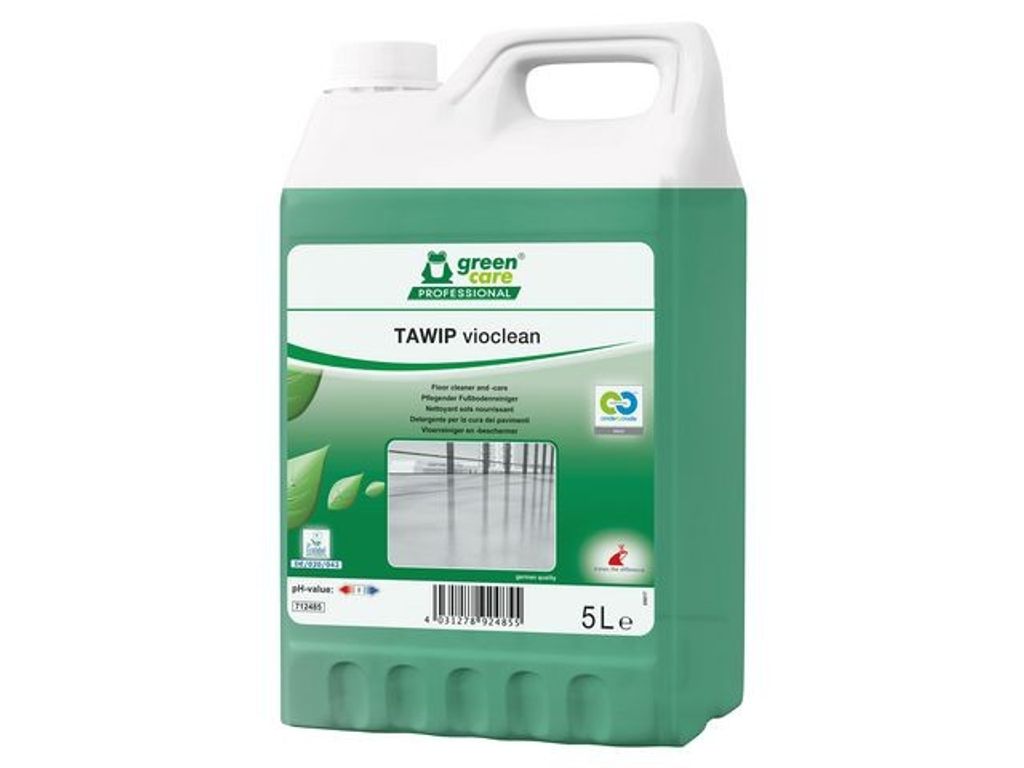 TAWIP vioclean är ett golvrengöringsmedel med extra vårdande effekt och exceptionella miljöegenskaper. Den värnar om människors hälsa och rengöringspersonalens säkerhet. Lämpar sig för mekanisk och manuell underhållsrengöring av alla vattentåliga golv, som t.ex. PVC, linoleum, gummi, sten och förseglat trä. Använd inte på oförseglat trägolv. - pH-värde: 7.9 (koncentrat), 8.1 (brukslösning) - Dosering: 0,25-0,75 %. 2,5-7,5 ml/liter vatten, Dosering i förhållande till användning och nedsmutsningsgrad. - Utseende: Grön vätska
