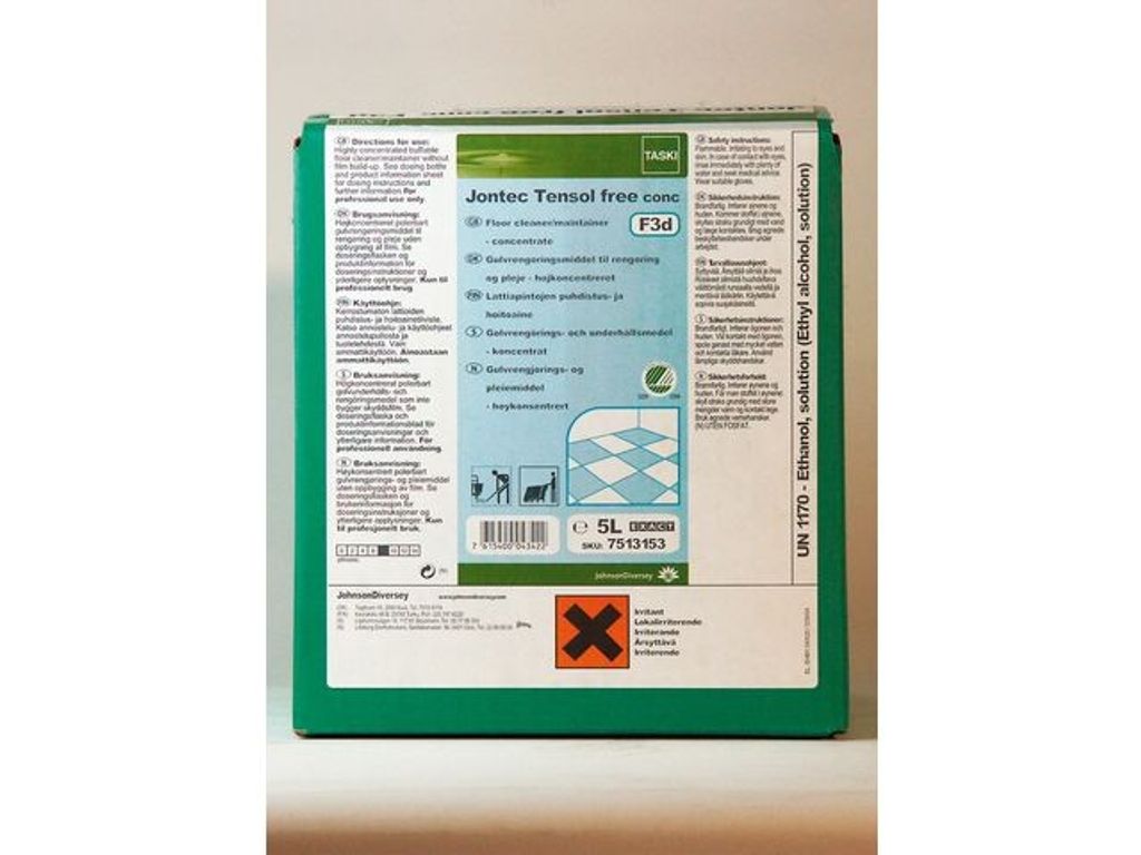 Taski Jontec Tensol Free golvrengöring och underhållsprodukt utan parfym och färg. Produkten är icke filmbildande och lämpar sig för rengöring och underhåll av golv. Icke filmbildande och är perfekt för underhåll av både behandlade och obehandlade vattentåliga hårda golv. Bildar en halksäker och smutsavvisande golvyta. Produkten är lågskummande. Ska spädas innan användning, för total kostnadskontroll och säkerhet används SmartDose-dosering. - Icke filmbildande - Parfymfri och utan färg - Polerbar - Lågskummande - pH-koncentrat: 9 - Relativ densitet: 0,98 g/cm3