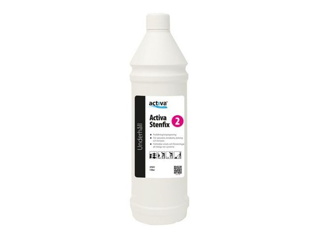 Lyfter fram stenens struktur och glans. Produkt för porfyllning av natursten, betong, terra-kotta och terrazzo (för inomhusbruk). Activa Stenfix 2 hindrar smuts och föroreningar att tränga ner i porerna. Produkten lyfter fram stenens struktur, gör den något mörkare och tillför samtidigt glans. - pH-värde: 8,0 i koncentrat - Oparfymerad - Dosering: Placeras i koncentrerad form på golvet efter användande av Activa Stenfix 1 - Utseende: Vit vätska